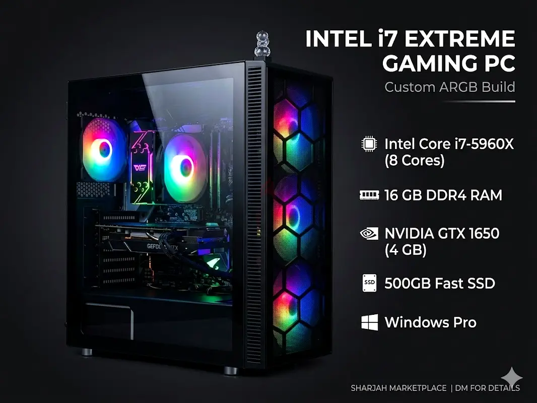 I'm selling my Alienware custom gaming desktop. I've used it for about 1–2 years with normal, everyday gaming. It runs an Intel Core i7-5960X (8 cores) and has 16GB DDR4 RAM. Storage is a 500GB SSD and the GPU is an NVIDIA GTX 1650 (4GB). It includes Windows 10 and comes with a free Full HD (1920 x 1080) monitor. The PC is in average condition with some signs of use mic jacks dont work need usb mic to use mic but fully functional. No warranty is remaining. Local pickup preferred; message me for more details or to arrange a viewing.