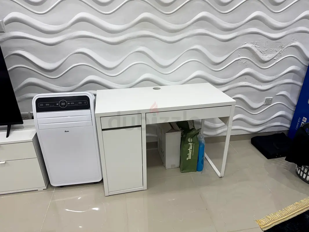 I’m selling my IKEA white study/computer desk with a drawer, cabinet and matching chair. I bought it about 6-12 months ago and used it only once, so it’s in flawless condition. The desk has a rectangular top that comfortably fits one person and includes a storage drawer and a small cabinet for supplies. It’s sturdy, clean, and ready to use with no scratches or marks.