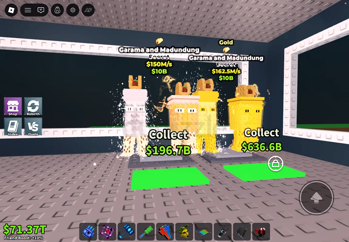 I'm selling a Roblox steal a barainrot Simulator X account shown in the screenshot. The image shows multiple high-value brainrot (including gold and secret variants) placed in a collecto r setup with large collect values visible (hundreds of billions). Account is almost new (0-1 month), in excellent condition, and has seen only light in-game usage. Rating is E and genres includ e Simulation and Action/Adventure. This listing is for the account/items as shown — brainrot, stats, and in-game progress visible in the screenshot.